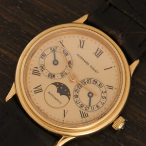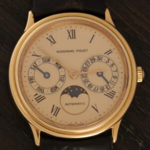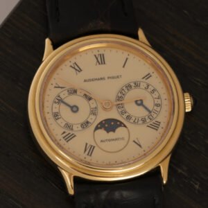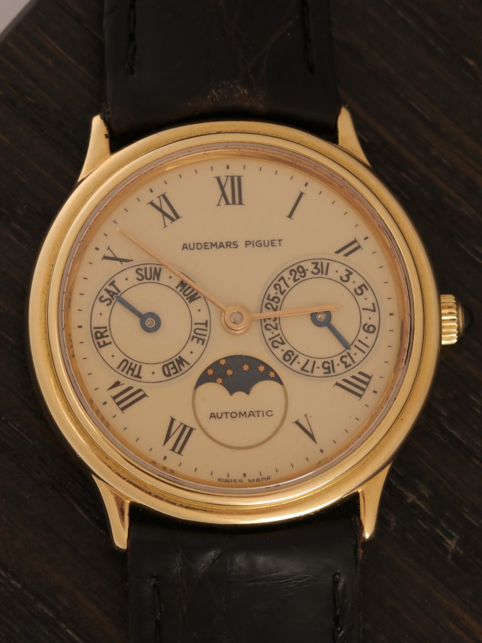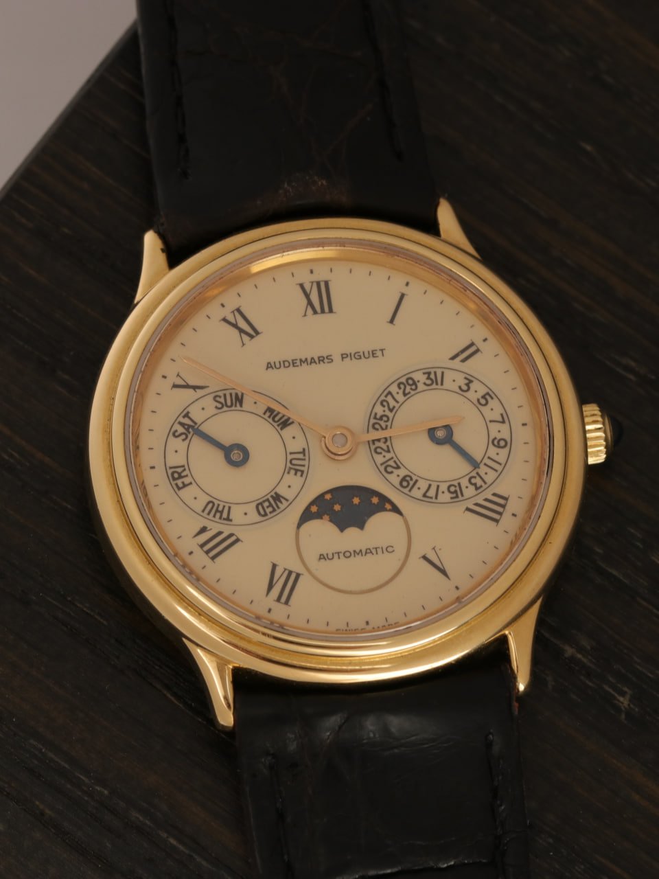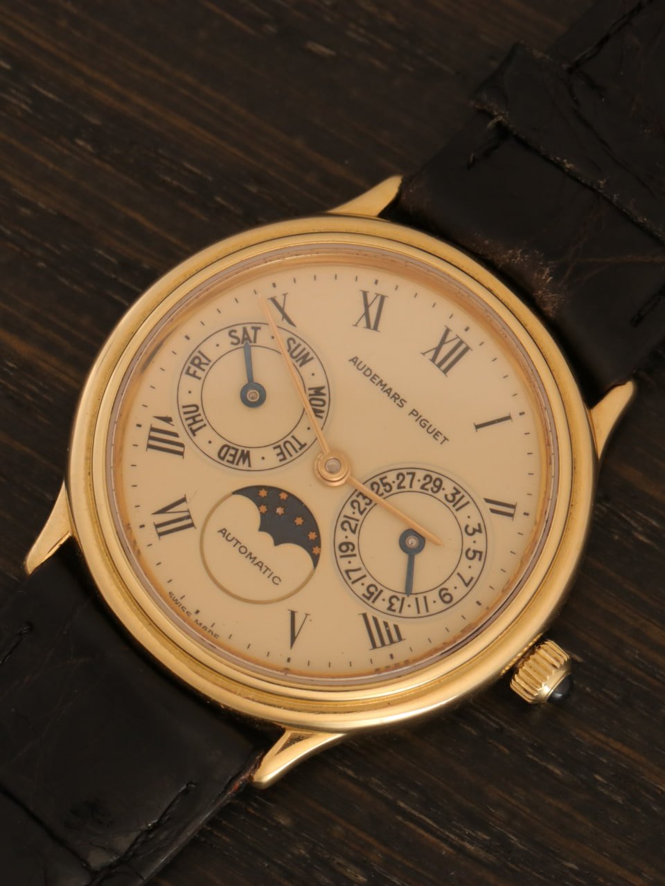 This Audemars Piguet Reference 25589BA Triple Calendar Moonphase from the 1980s highlights the brand’s sophisticated design language outside the Royal Oak line. The watch features a 33mm 18k yellow gold case, mineral crystal, yellow gold crown, and a period correct stepped bezel that defines its understated elegance.