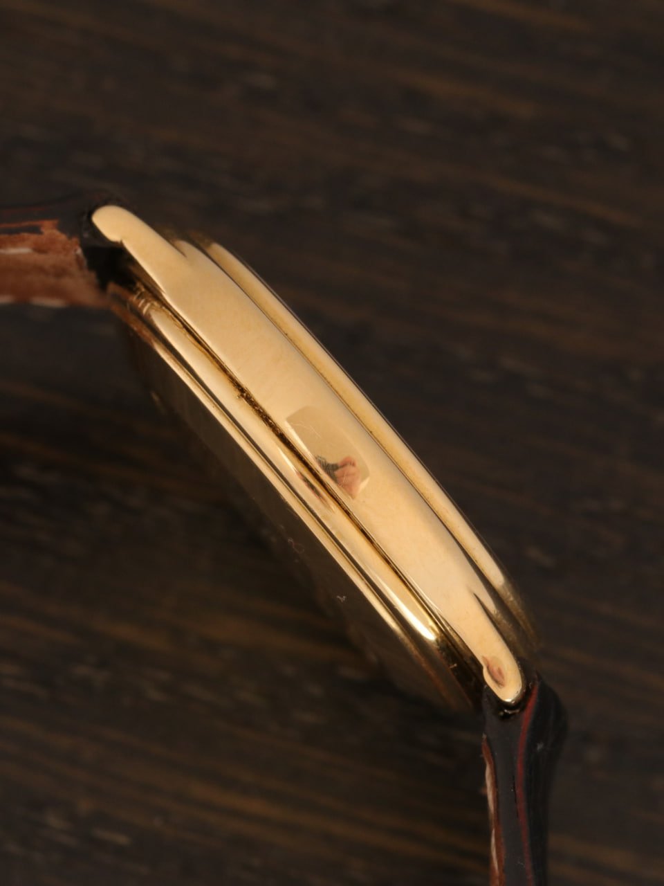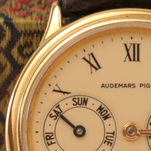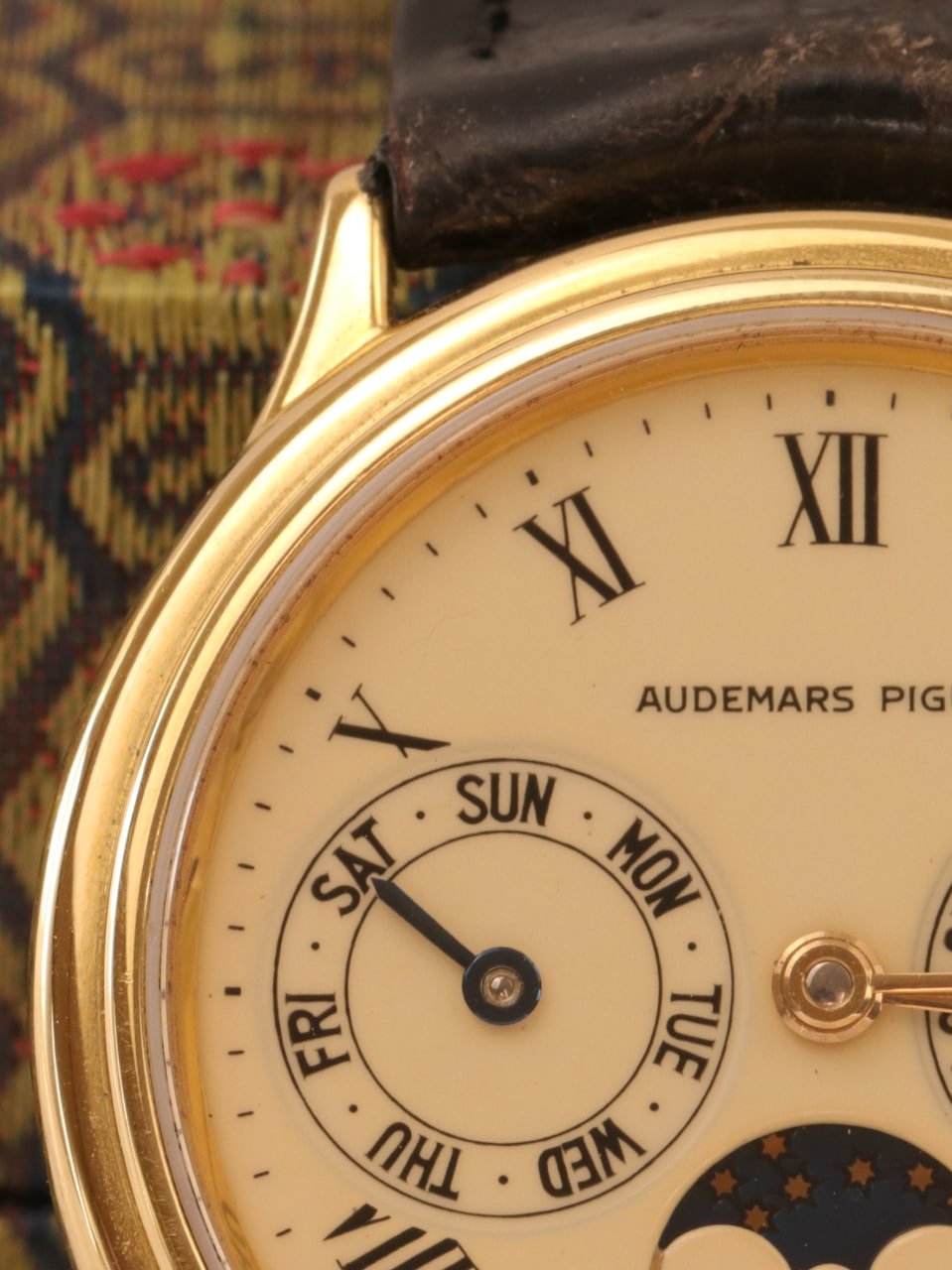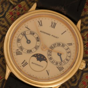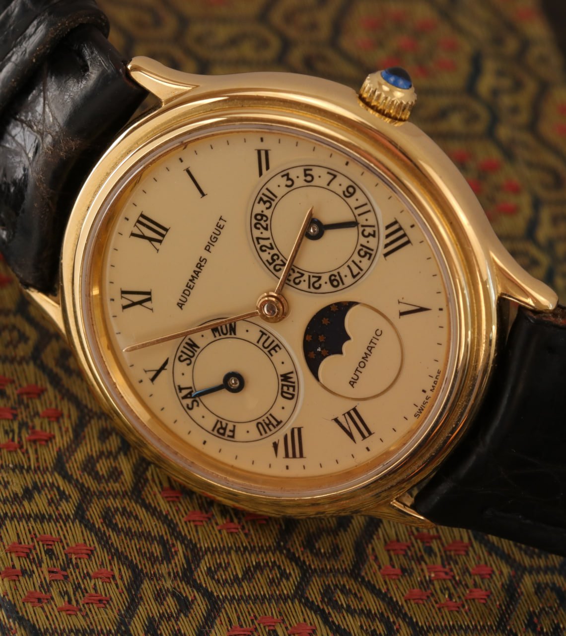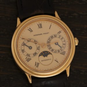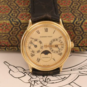 This Audemars Piguet Reference 25589BA Triple Calendar Moonphase from the 1980s highlights the brand’s sophisticated design language outside the Royal Oak line. The watch features a 33mm 18k yellow gold case, mineral crystal, yellow gold crown, and a period correct stepped bezel that defines its understated elegance.